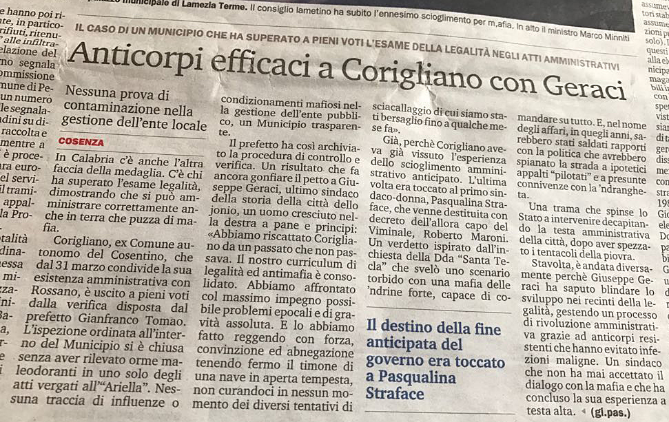 {module Firma_Anton Giulio Madeo}Ci spiace dirlo, soprattutto per chi ci ha creduto veramente, ma l’antimafia non tira più come strumento di lotta politica. Ha perso smalto e credibilità. Se ne volete la prova pensate a tutti quei coglioni che, qui a Corigliano, nei mesi scorsi, dopo l’insediamento della commissione prefettizia antimafia, si sono armati di penna e trombone per cantare…